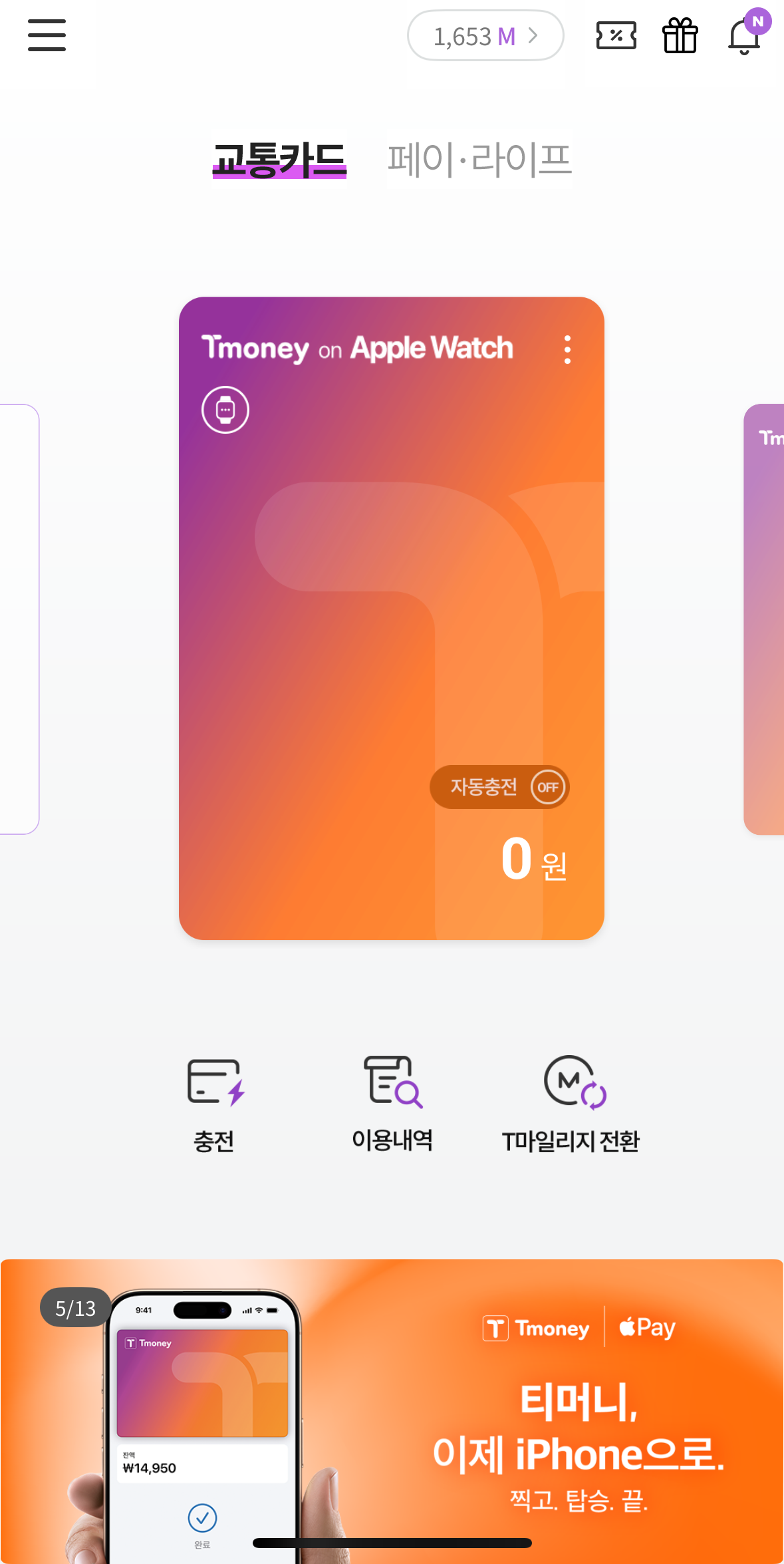 모바일티머니 앱에서 충전은 계좌이체/현대카드/애플 페이(현재는 현대카드 only)/T마일리지 로만 충전이 가능합니다.